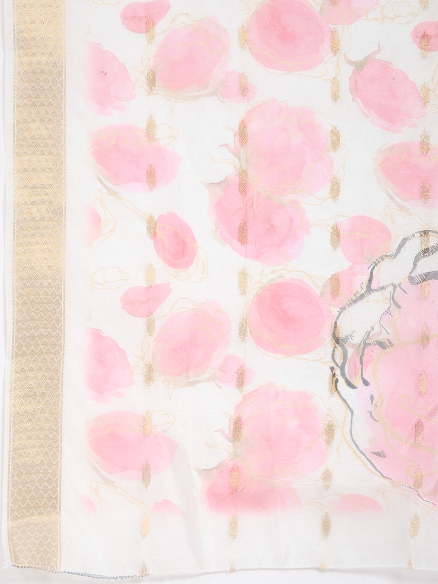 Off-White & Peach Embroidered Roman Silk Kurta Pant Dupatta Set