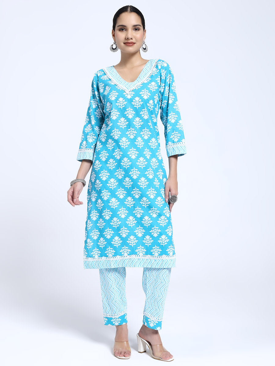 Sky Blue Printed Cotton Kurta with Matching Straight Pants